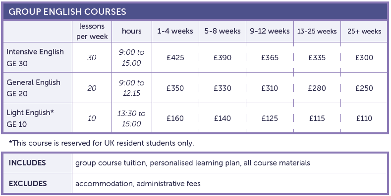 General English is a popular programme for students who are beginning their English-learning journey. The course is taught at an ideal pace that allows students to improve their skills and enjoy their time living in England. This course offers 20 lessons per week (15 hours) and runs from 09:00-12:15 each weekday.